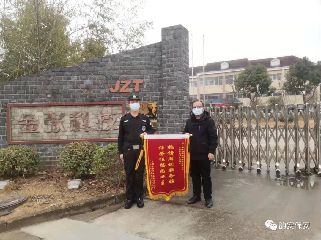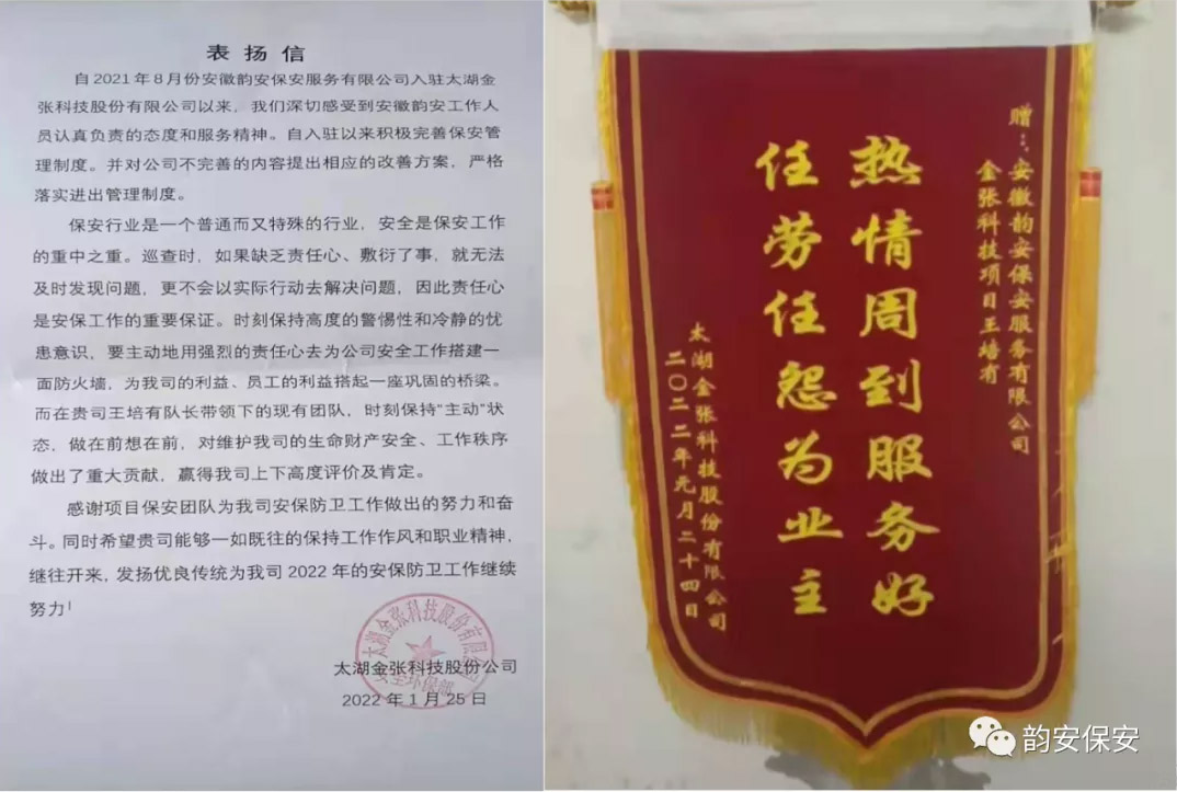 安徽韻安保安服務(wù)有限公司自承接太湖金張科技股份有限公司安保項目以來,公司領(lǐng)導(dǎo)高度重視,深入現(xiàn)場,組織人力,認(rèn)真負(fù)責(zé)做好各項安保服務(wù)工作,及時有效地完成各項任務(wù)。為此,時值小年,客戶先后送來表揚信與錦旗,對韻安公司做好安保服務(wù)項目各項工作給予高度肯定與贊揚。